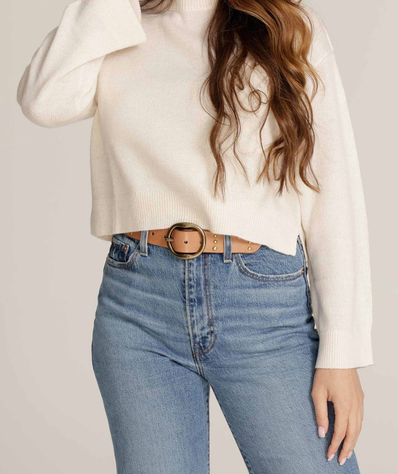 Dion Round Buckle Leather Studded Belt-Beige