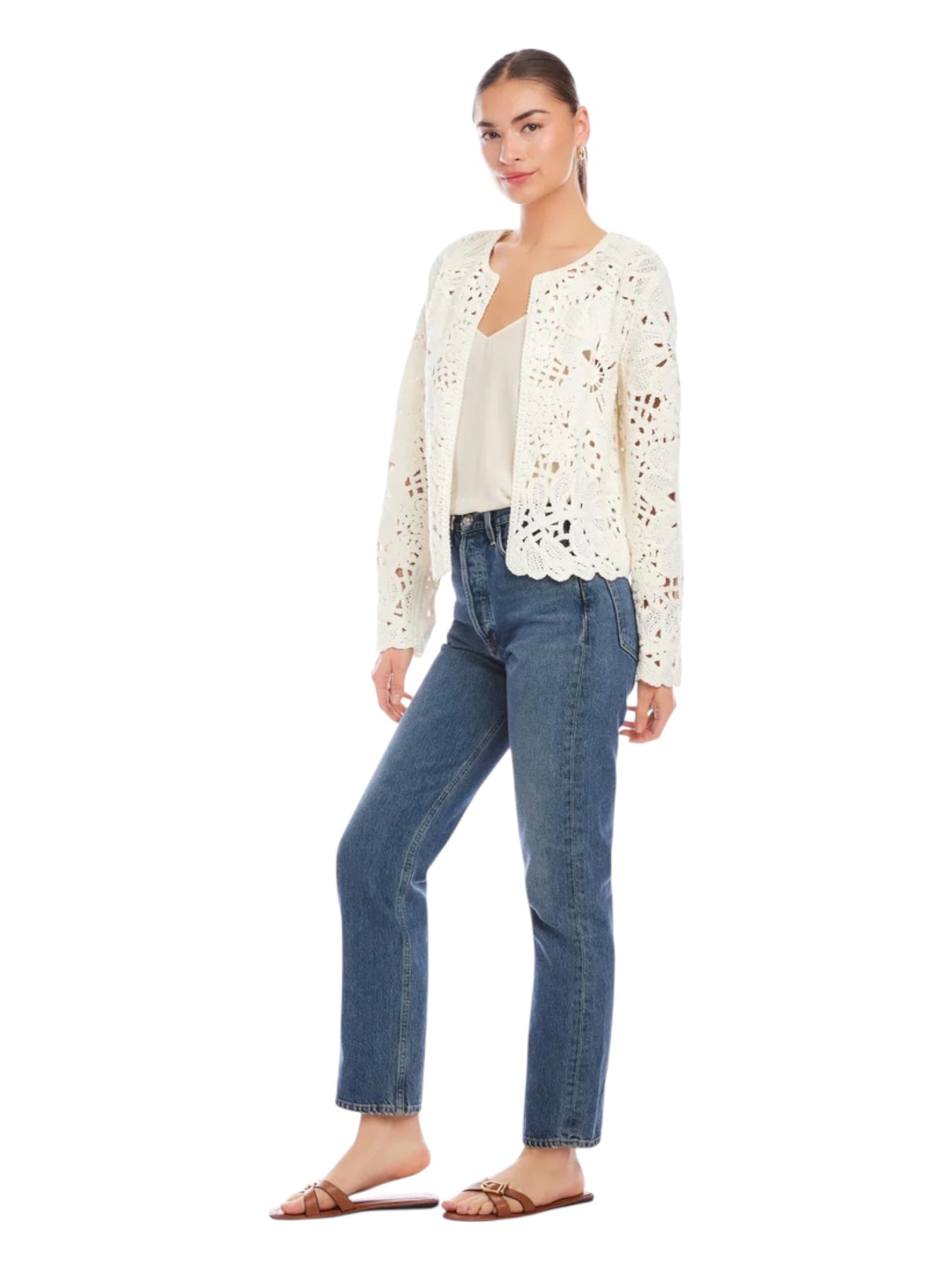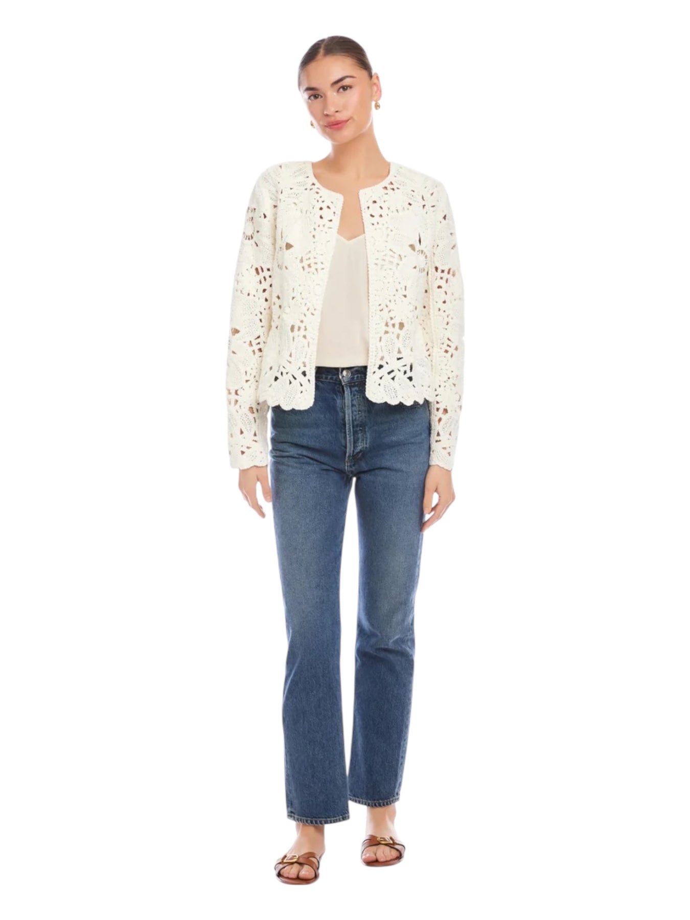 Intricate crochet stitching charms this layer-perfect jacket knit with a layer-perfect open front and sweet scalloped trim.