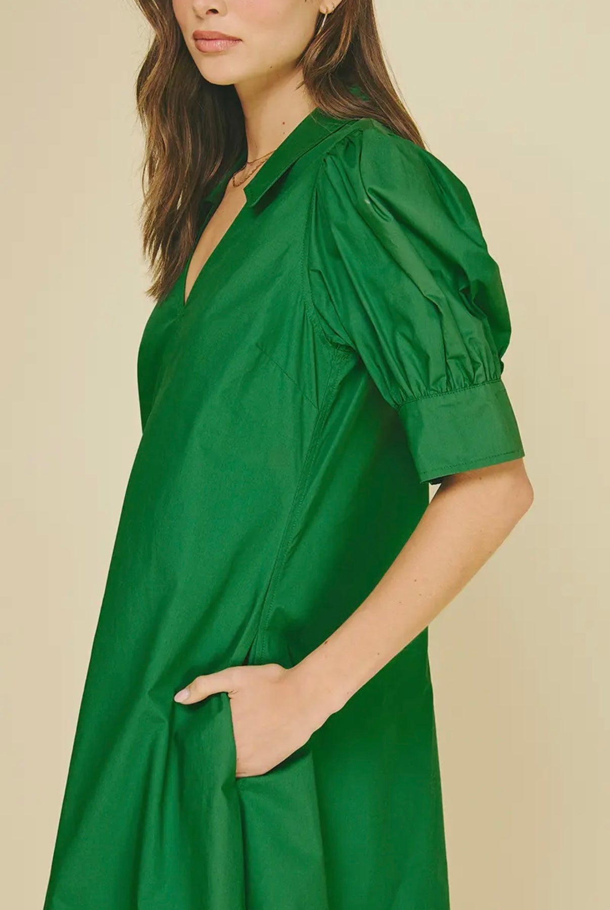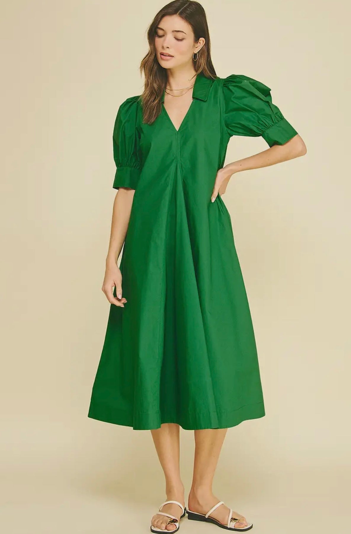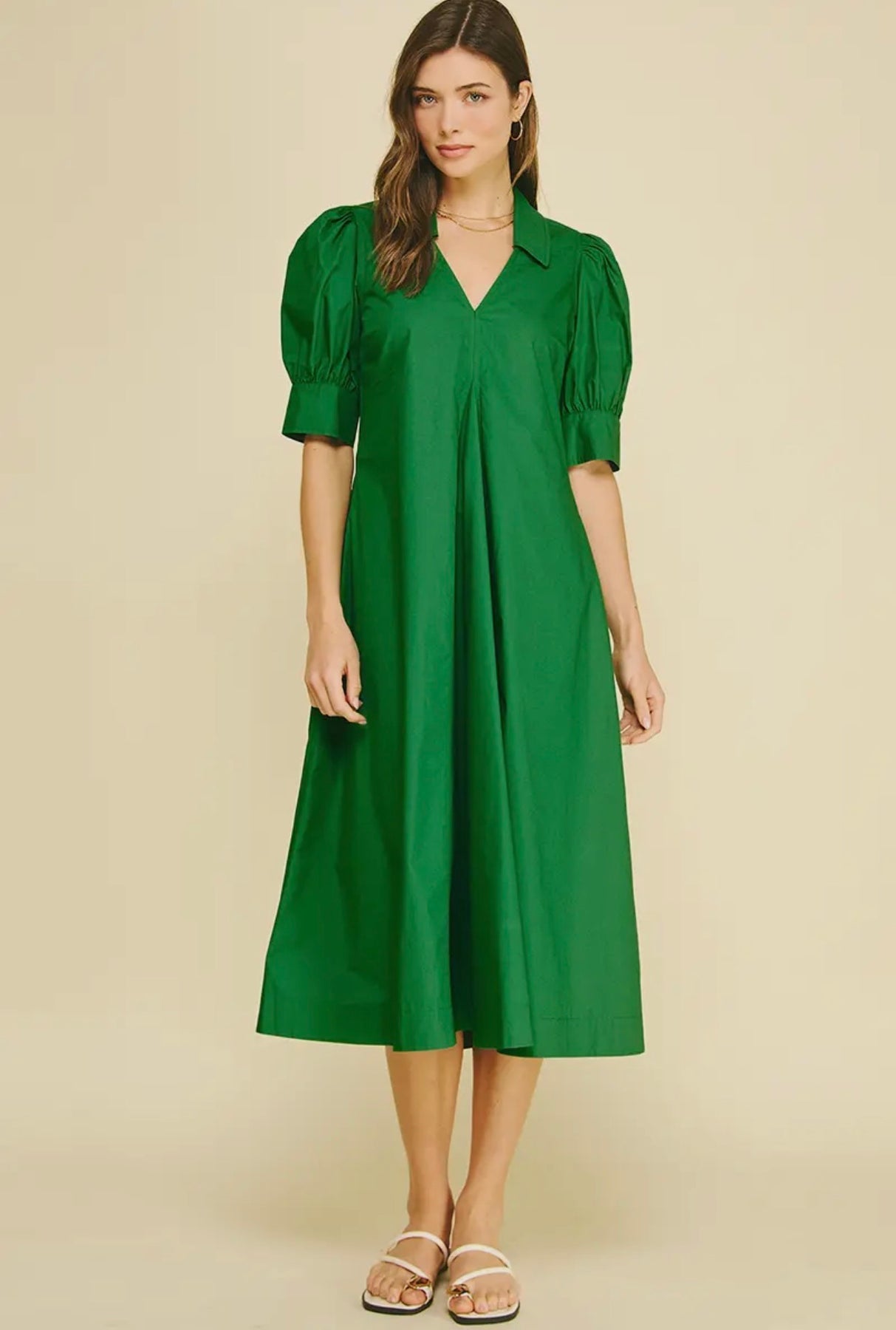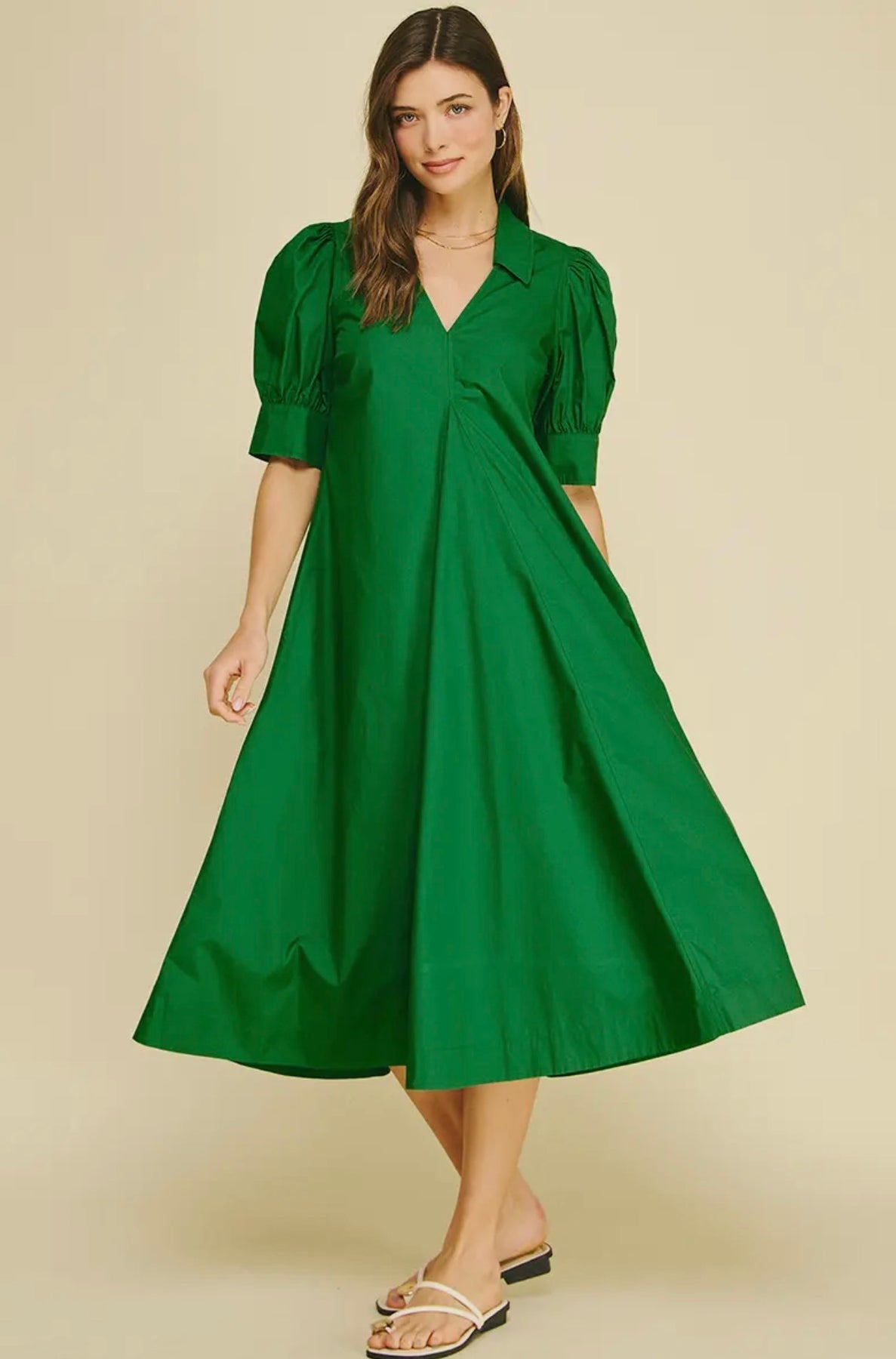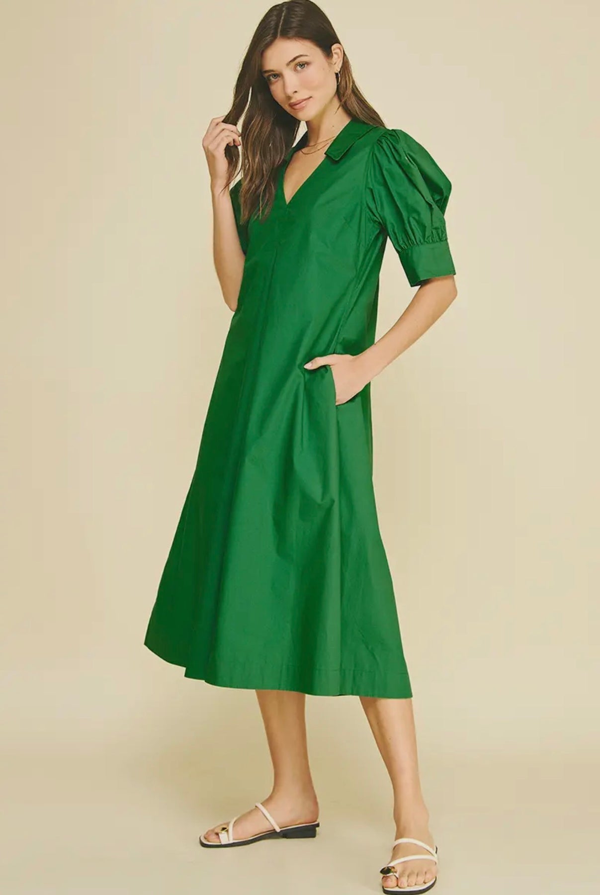Pleated Polished Cotton Midi Dress-Grass Green