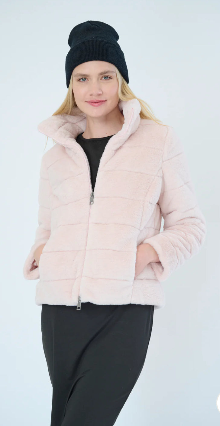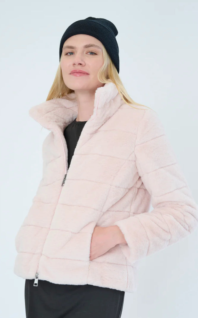A chic, cozy faux fur quilted jacket that you will always be grabbing for. When working from home or going on an errand run, you will be sure to grab this jacket to keep you warm. Silver Two-Way zipper Pulls. Hidden side pockets.
