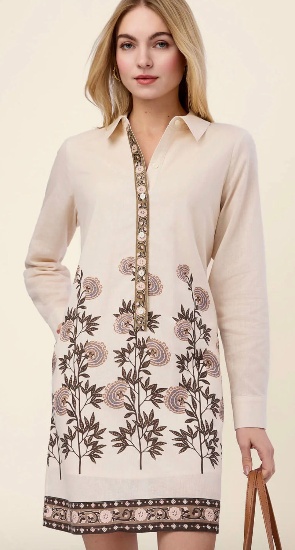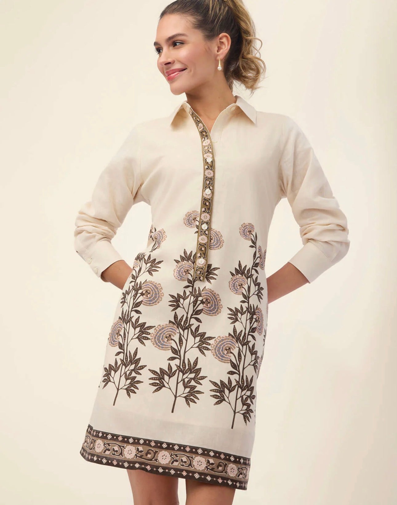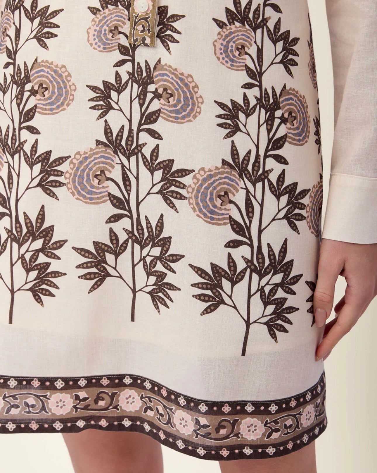 Everyday dressing has never been easier with the Penelope dress. The shirt dress shape and the black floral pattern over a neutral beige canvas combine to create a refreshed, transitional look. Partner this flowy linen and cotton blend number with a denim jacket and a gold jewelry for a curated day-to-night style.