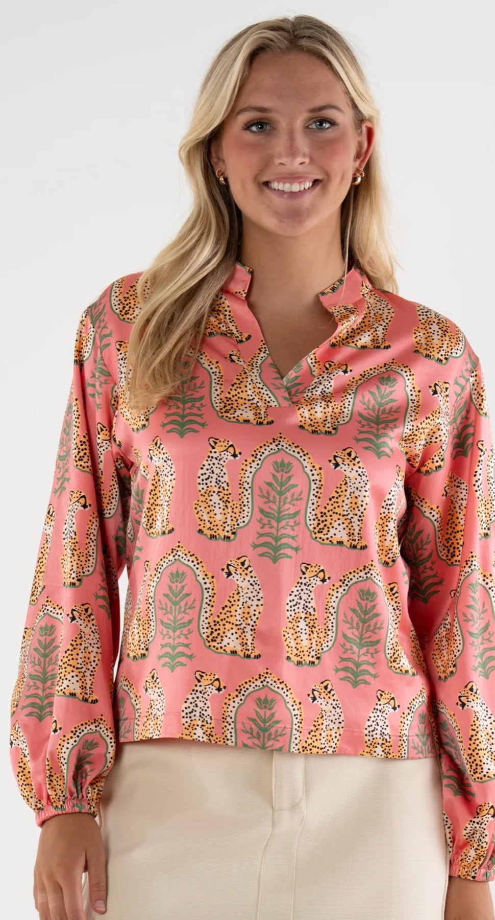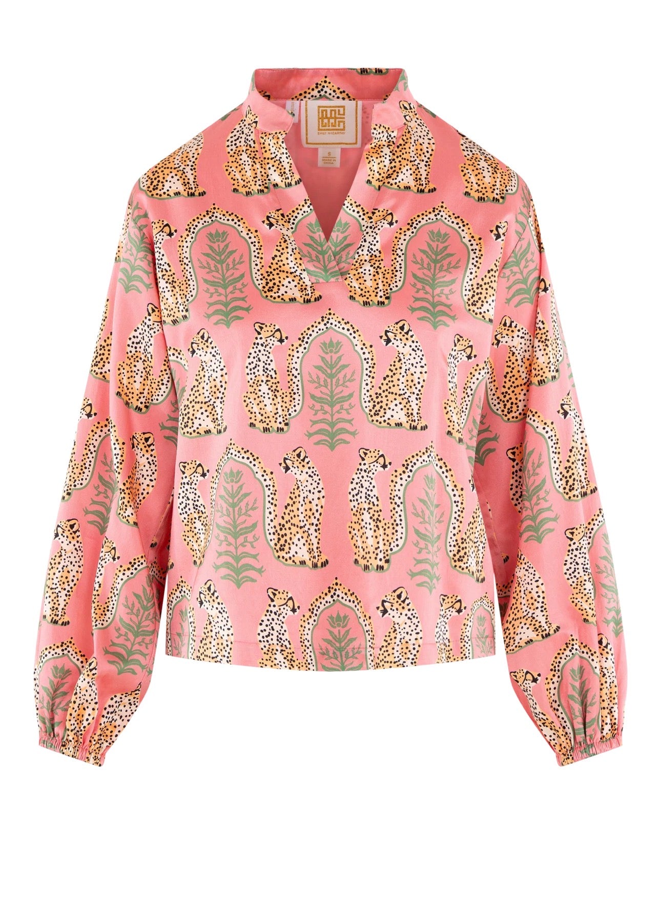The Lolli Top in Cabana Cat is a statement piece designed with a mandarin-style collar, softly gathered blouson sleeves with elastic cuffs, and an easy silhouette. The playful Cabana Cat motif pairs spotted cheetahs with delicate greenery, creating a whimsical yet artful print that feels both fresh and intentional. Effortless in shape but rich in personality, this style transitions seamlessly from daytime luncheons to spring soirées, offering a distinctive charm.