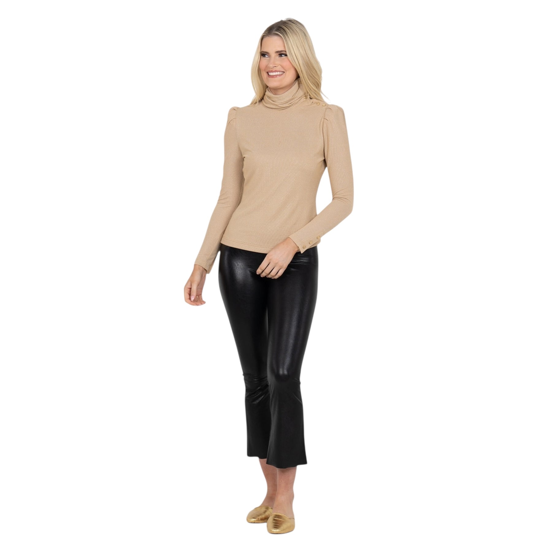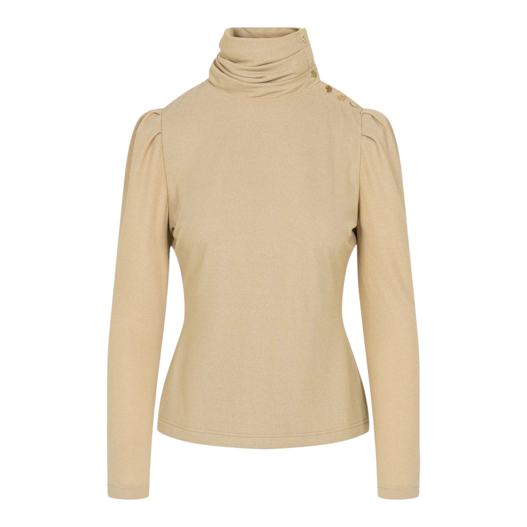 The Tessa Turtleneck in Metallic Gold Knit is an elevated layering essential with a subtle hint of shimmer. Designed with a gathered mock neck and delicate puff shoulder detail, it balances structure and femininity. Its slim, tailored silhouette offers a flattering fit, while metallic threading woven throughout the knit fabric adds a refined touch of sparkle. The perfect piece to wear on its own or layered under blazers and jackets for the season.