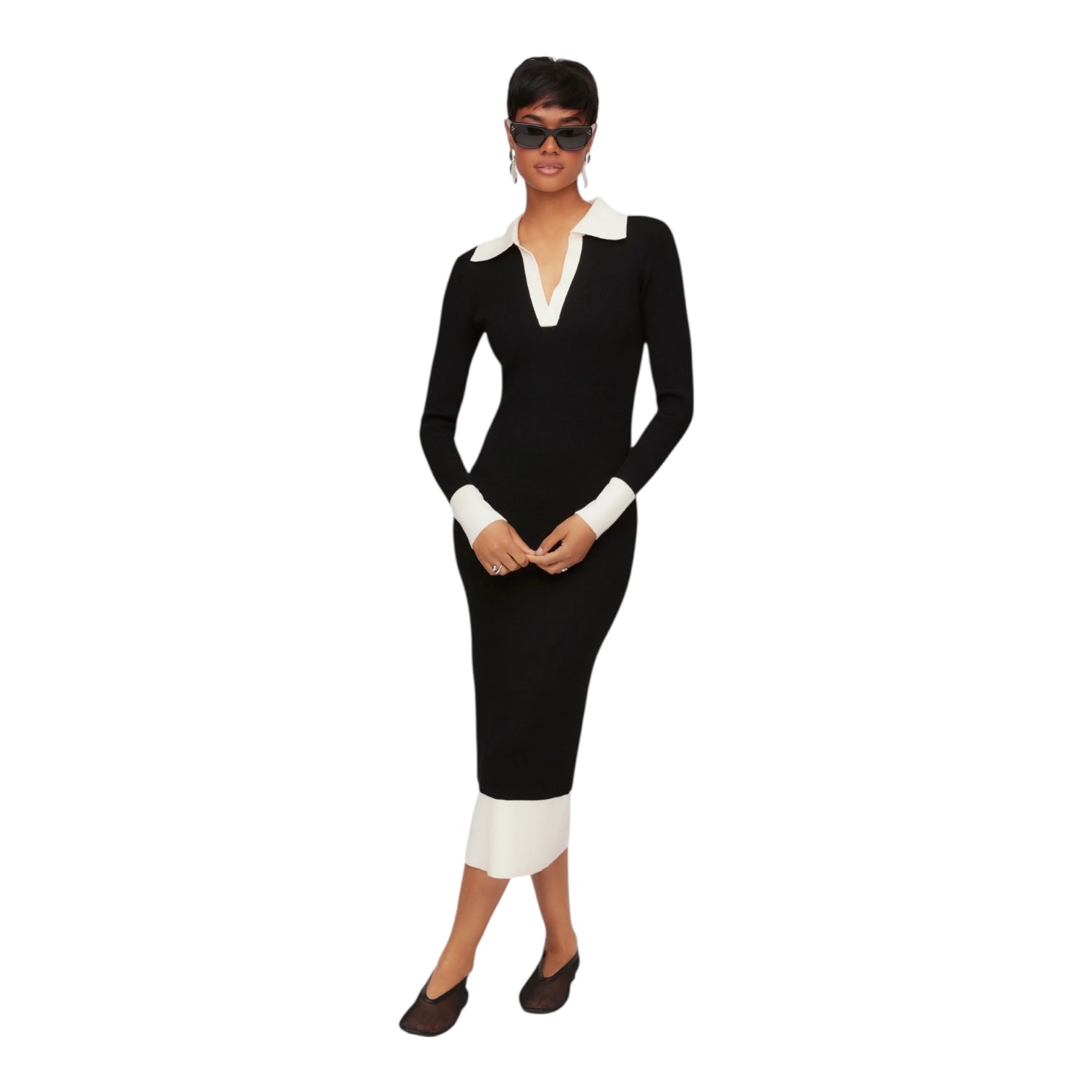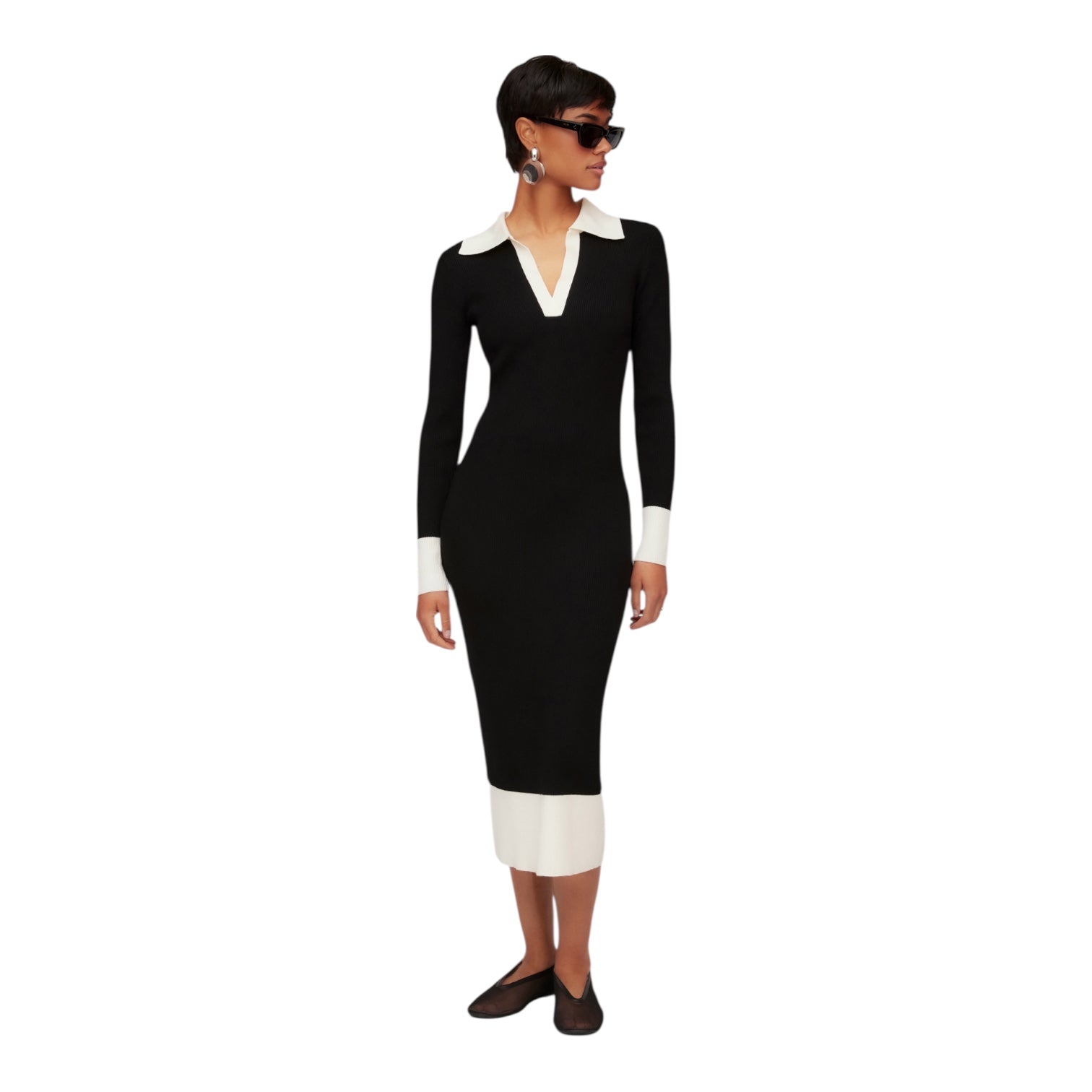 The Belle Ribbed Polo Dress is a refined take on a timeless silhouette. Designed in a ribbed texture, this pull-on midi dress features a contrast collar, cuffs, and hem for a striking finish. The deep V-neckline and body-skimming fit create an effortlessly sophisticated look.