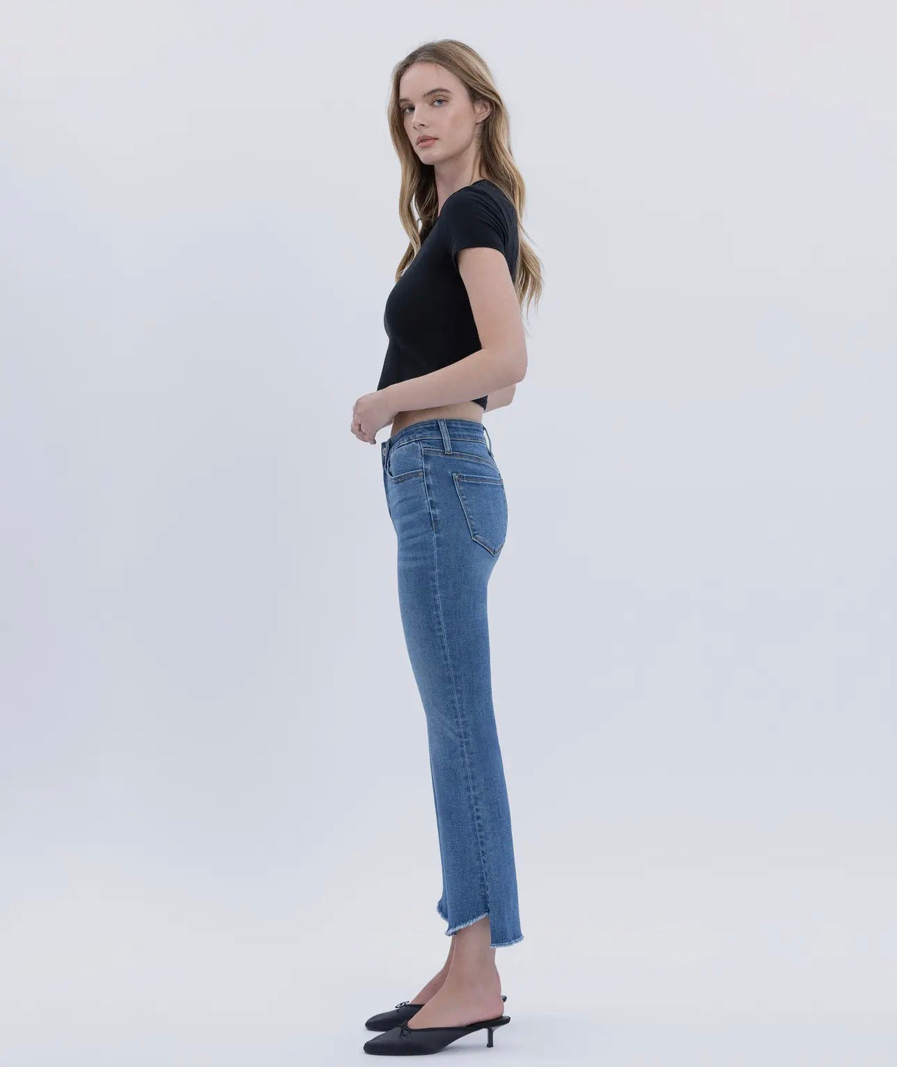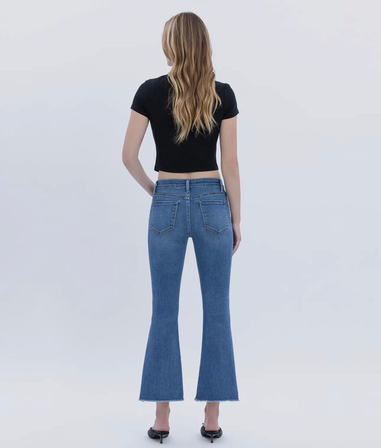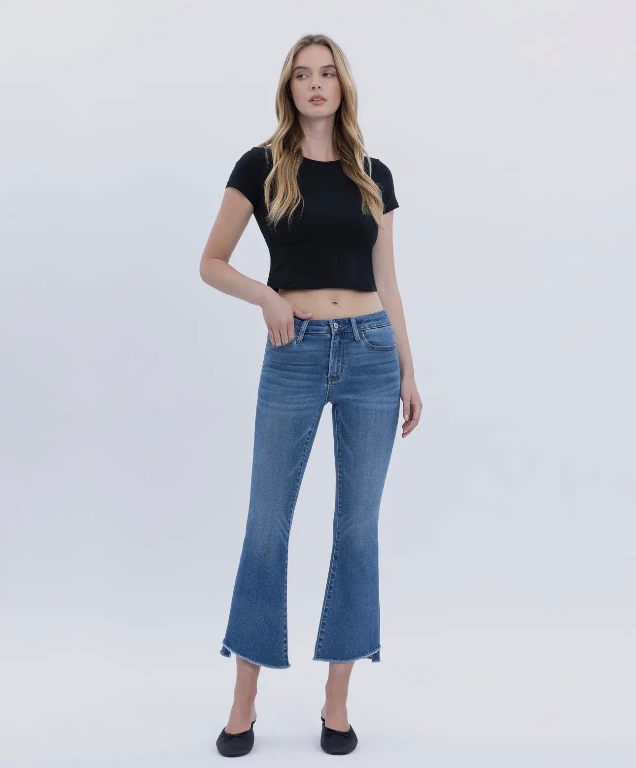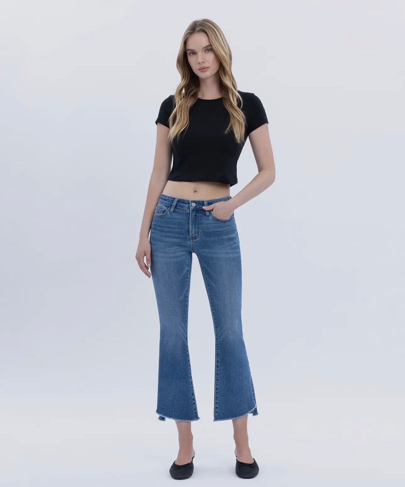 Mid rise raw step hem crop flare jeans Comfort stretch denim, mid rise waist, 5 pockets, raw step hem, cropped length, medium wash, flare jeans