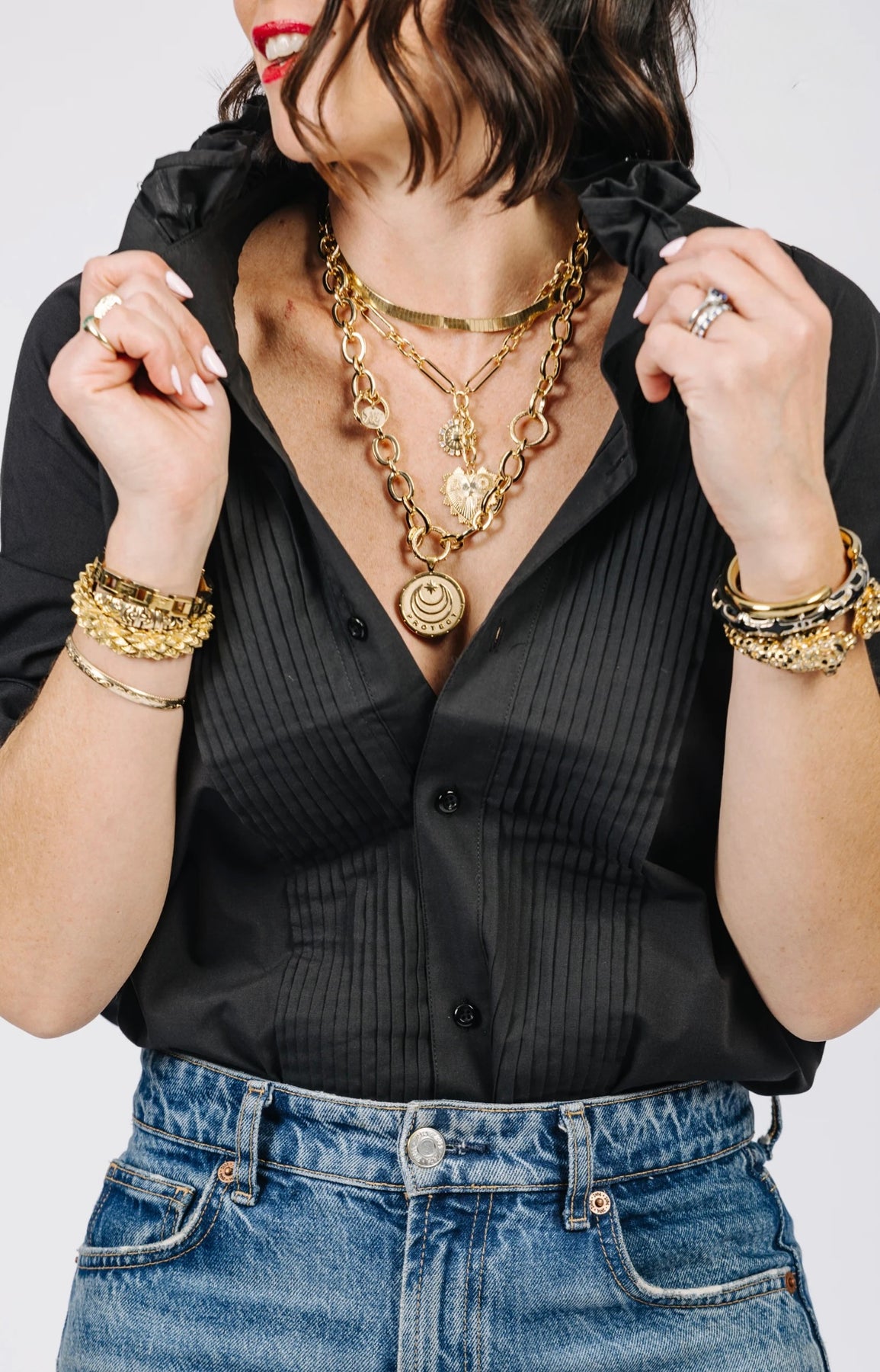 Our 3/4 puff sleeve at the elbow, accentuated by an inverted pleat at the cuff with a ruffle collar.